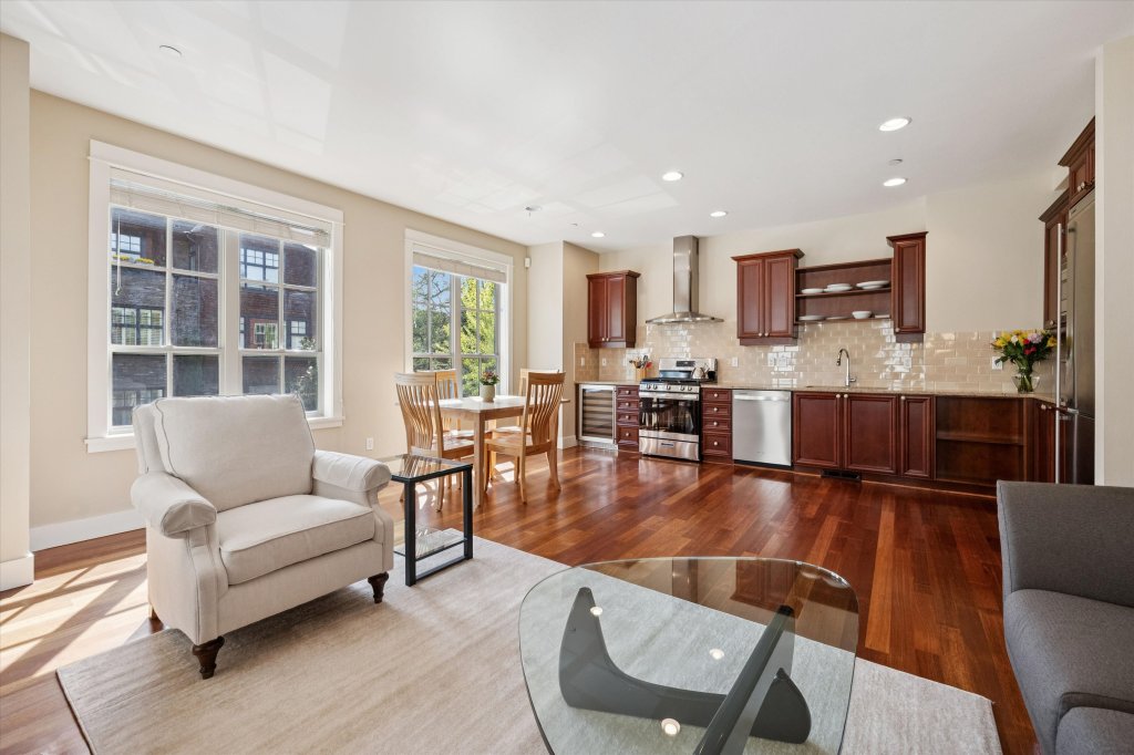 A private laundry area and direct access to a separate upstairs office provide an ideal setup for remote work or creative pursuits.