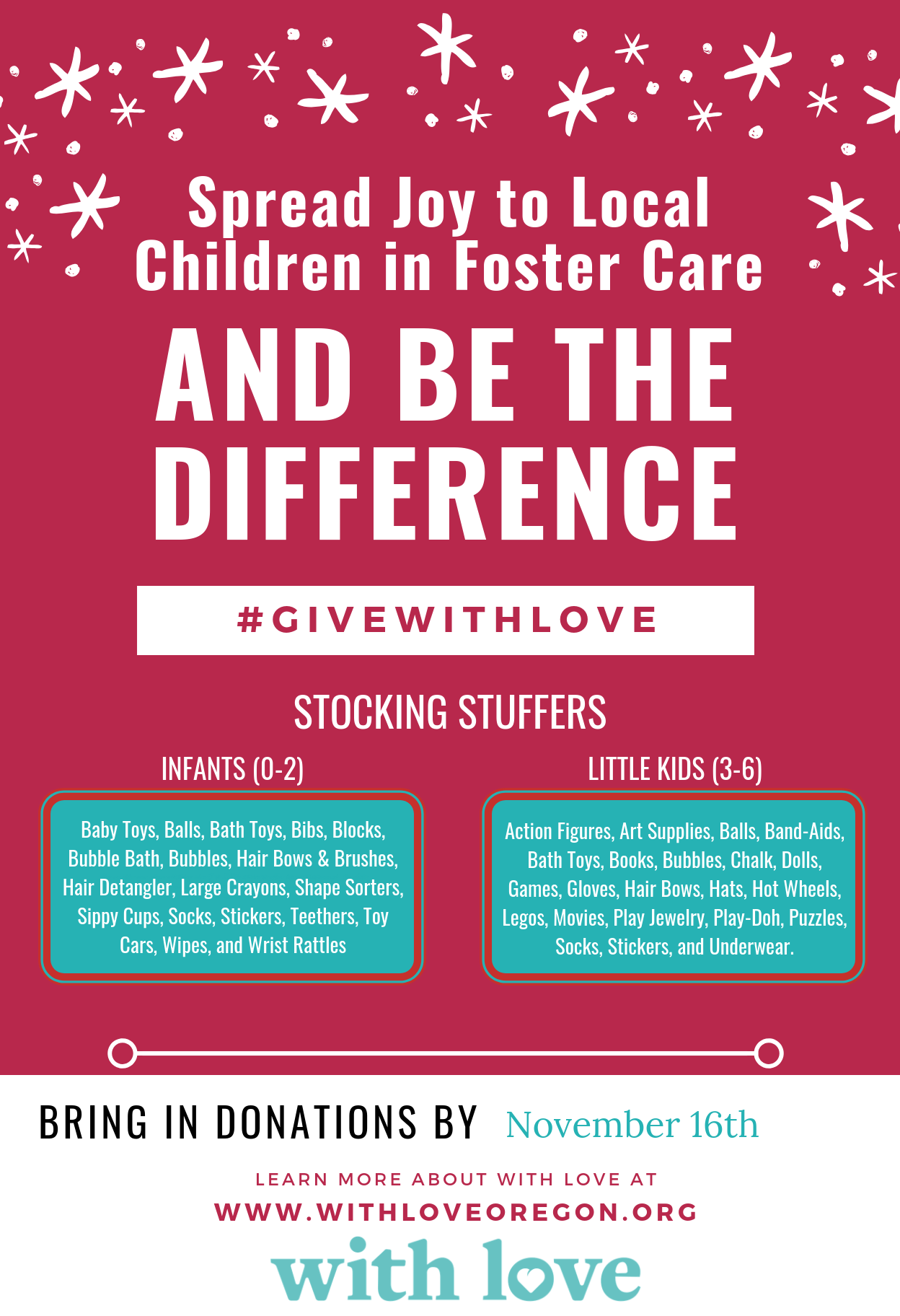 With Love. This non-profit’s mission is to support foster families by providing safe, clean and quality clothing and supplies for children ages 0-6. Their Season of Giving includes a Stocking Stuffer Drive with a deadline of November 16. Items needed include: baby toys, balls, bath toys, bibs, wrist rattles, action figures, art supplies, dolls, games, and play jewelry. Check here for a complete list. Donations must be dropped off at the warehouse by November 16. 8178 SW Durham Road, Tigard. Hours: Tuesday evenings from 7:00 p.m. to 8:30 p.m. and Wednesday/Friday 11:00 a.m. to 1:00 p.m. If you’re collecting after the 16th, check here for ongoing needs. You can drop smaller items at the River West Church in the With Love bin located in the lobby: 2000 Country Club Road. Hours: Tuesday-Friday 9:00 a.m. to 5:00 p.m.