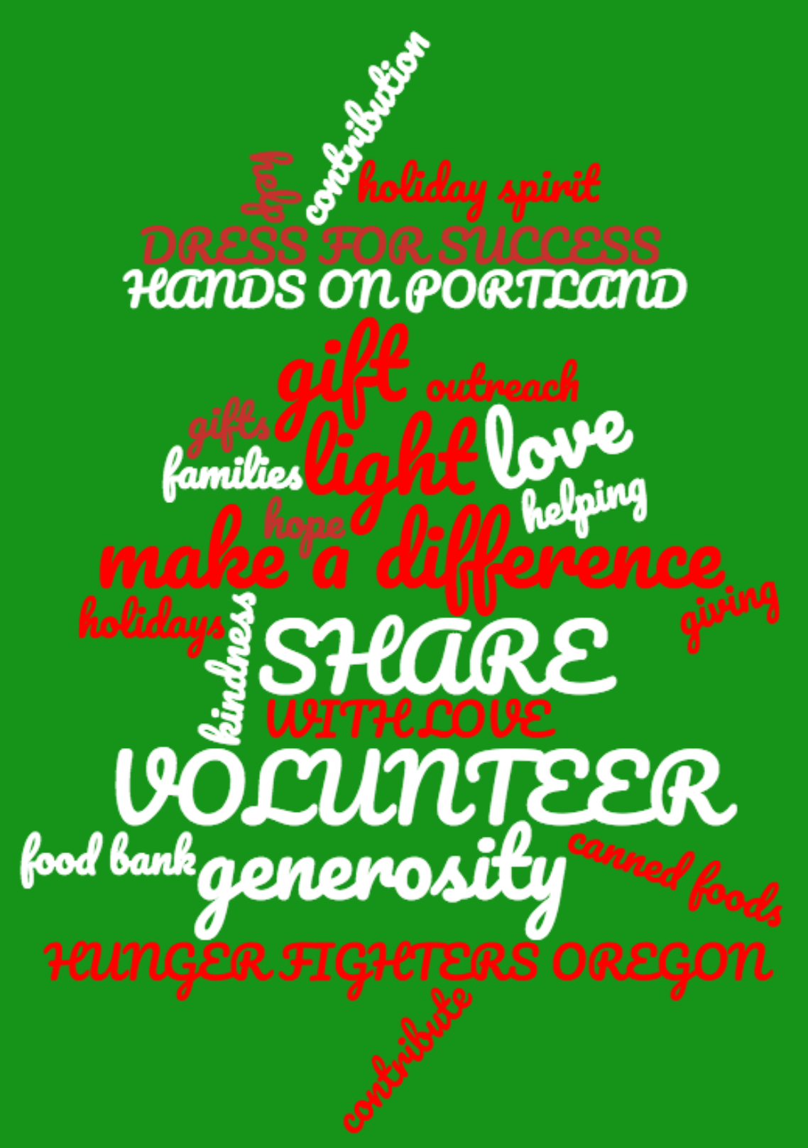 HandsOn Portland. Check their calendar for ongoing as well as one-time volunteer opportunities. Many occur year-round such as serving at Potluck in the Park in Portland or delivering books to the Children’s Book Bank. But there are holiday-related events too such as the Holiday Cheer Gift Bag assembly (December 1 from 9:30 a.m. to 12:30 p.m.) and distribution (December 2-24) to isolated older adults in the Portland metro area.