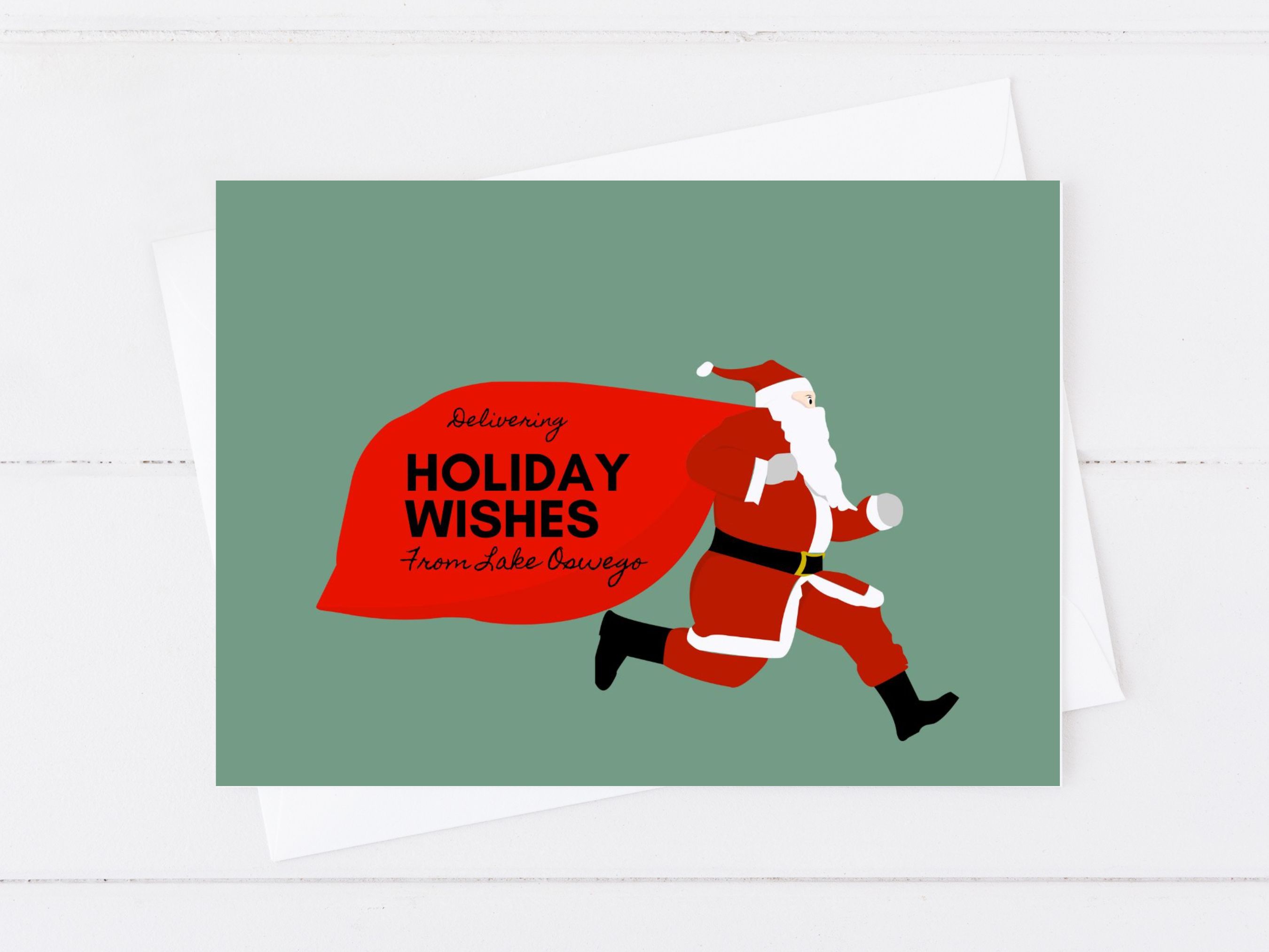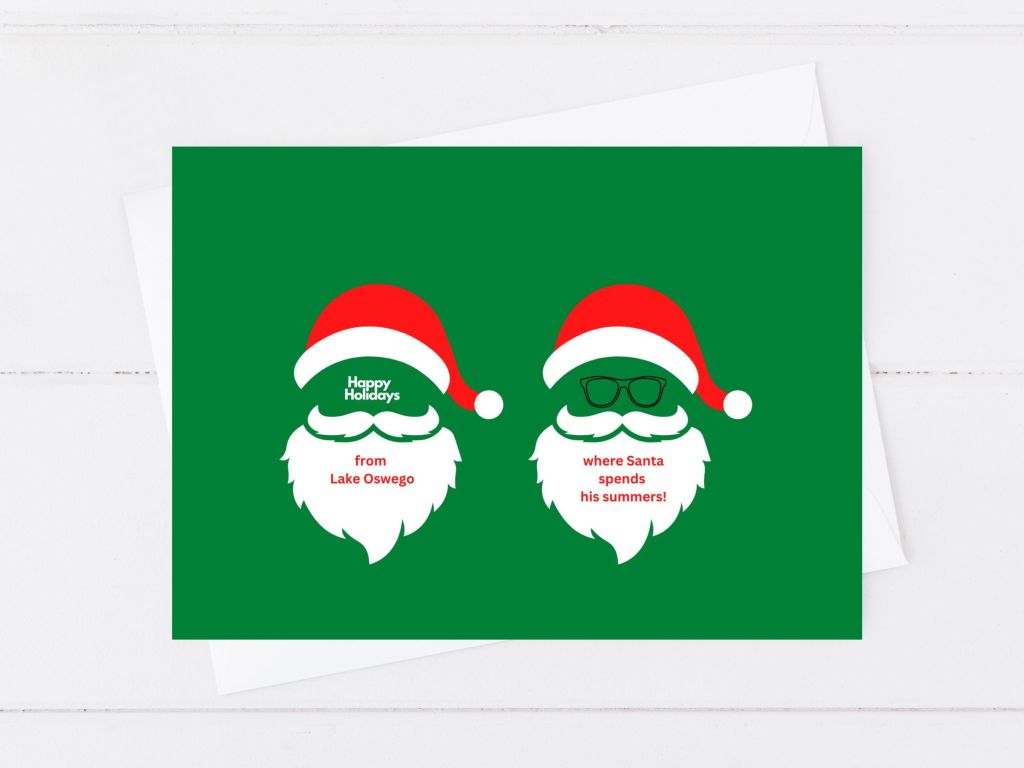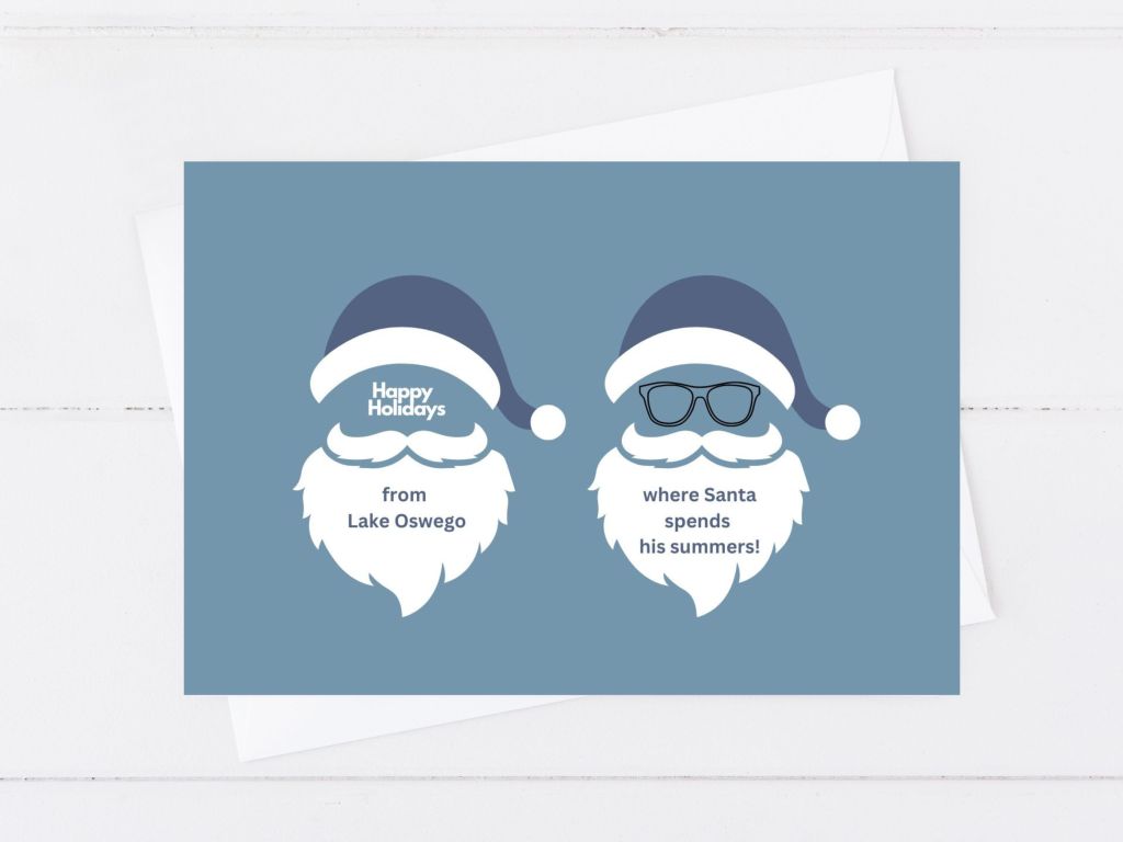It’s official! Even Santa loves Lake Oswego. According to a new holiday greeting card put out by my wife and daughter’s Etsy shop, heartspun printables, Lake Oswego is where he likes to spend his summers!