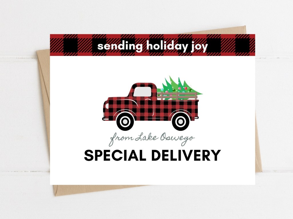 You can find other creative spins on sending holiday wishes from Lake Oswego, by checking out their Etsy shop. The good news is that their cards are instant downloads so you only pay once and the file is yours to keep and print as many times as you wish. You can print them at home or send them to a local printer and have them do it for you.