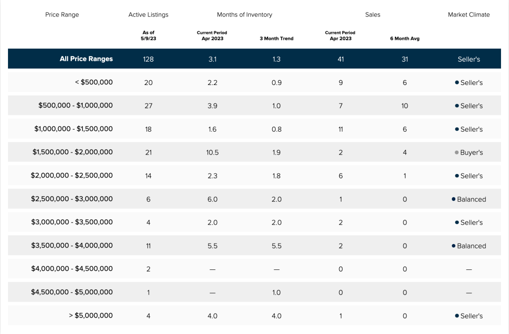 Something we are seeing that we haven’t seen in a while which is good news for buyers is a buyer’s market in the $1.5M to $2M price range and a balanced market in the $2.5M to $3M and $3.5M to $4M price range. That determination is made based on months of inventory, which refers to the number of months it would take for the current inventory of homes on the market to sell given the current sales pace.